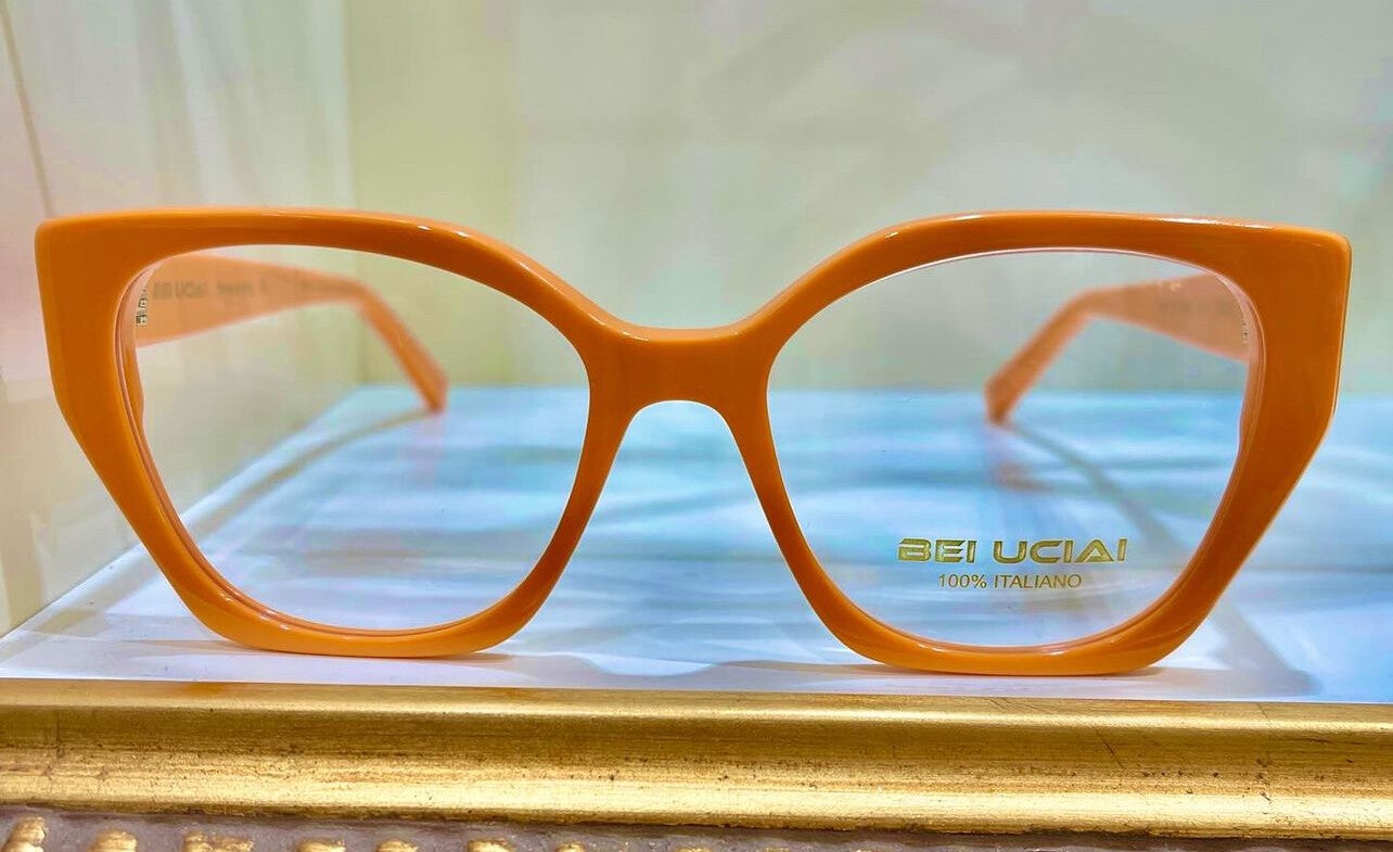 Occhiale da donna in celluloide arancione, con delicata forma a gatto. Elegante e vivace, dona un tocco di carattere senza eccessi.