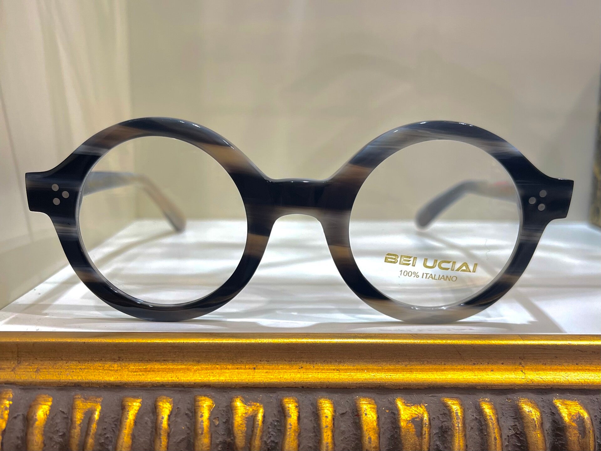 Occhiale da donna in celluloide con variegature dal nero al sabbia. Montatura tonda dal fascino elegante e senza tempo.
