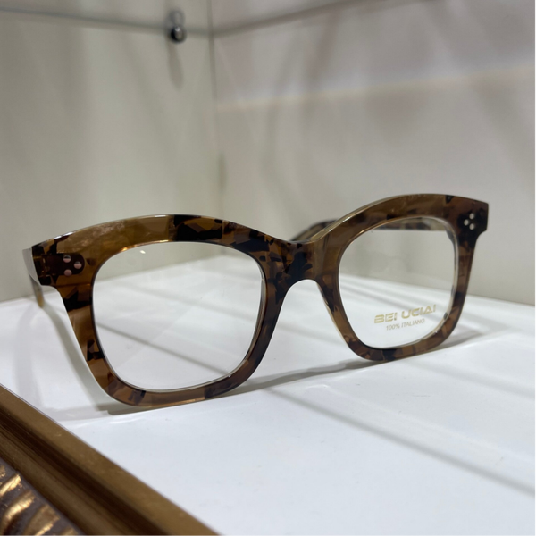 Occhiale da donna interamente in celluloide, con una raffinata fantasia effetto marmo nelle tonalità calde del terra di Siena e sabbia. La montatura, elegante e leggera, incornicia lenti quadrate dalle linee morbide, donando un look sofisticato e senza tempo.